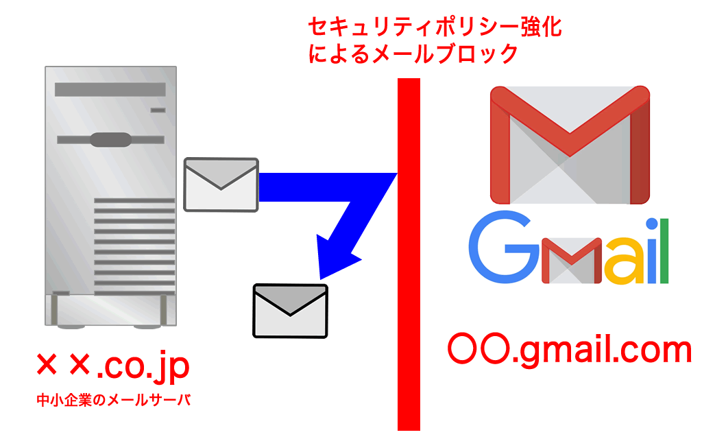 これは独自のドメインや企業ドメインなどを自社運営する中小企業にとって手痛いセキュリティ強化となっており、未対応の場合、自社メールアドレスからメールを送ってもGmailのメール宛に届けられなくなっています。