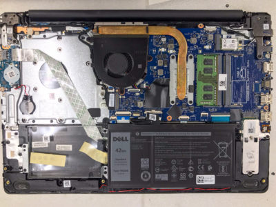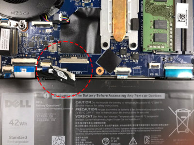 最近のノートPCは内蔵式なので少し面倒ですが、バッテリーのコネクタを必ず外してから交換します。