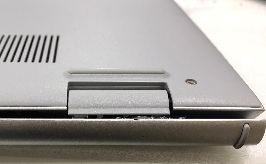 スリムでデザイン性を優先しているのだと思いますが、普通に使っていてもまずは壊れている事が多く、当店ではメモリーや電池、ハードディスク交換で本体パネルを開ける修理の際には、必ずチェックするよう、お預かり用紙にはチェック項目を必須としています。当店が壊した、と誤解されないような予防措置ですが、それぐらいひび割れや破損が多いのがヒンジです。