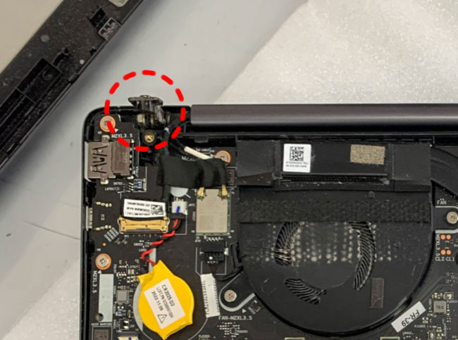 写真左上、この写真は裏側を撮っているので実際はキーボード右上側のヒンジ接続部が壊れています。